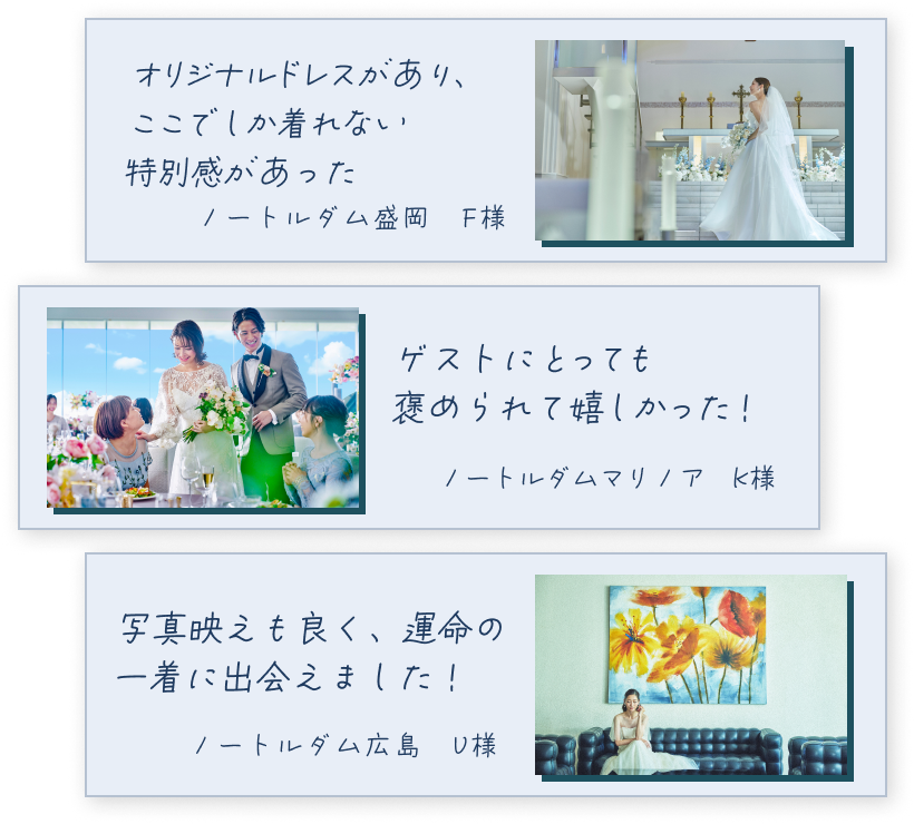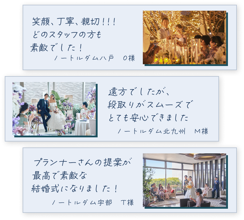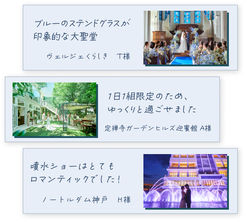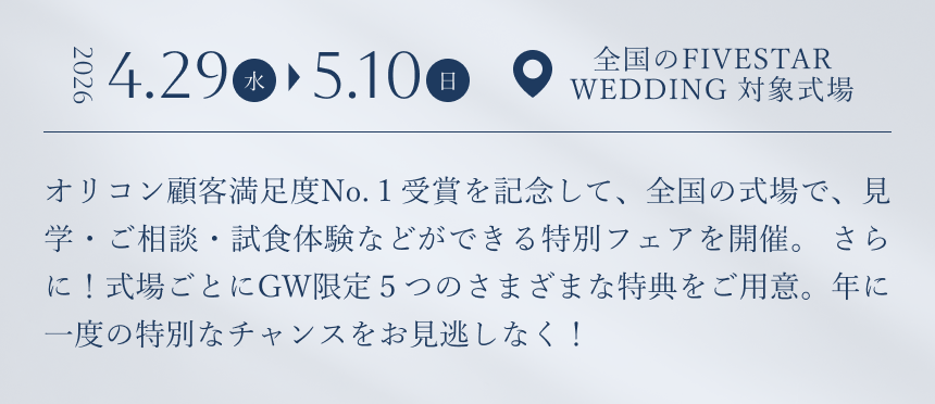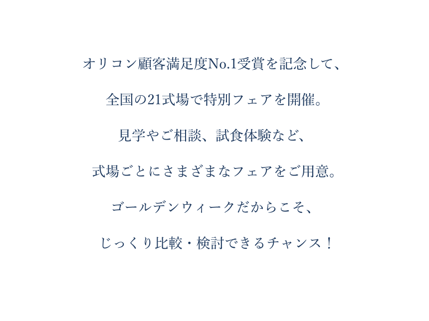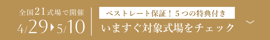 会場見学やご相談、試食体験など、式場ごとにさまざまなフェアをご用意しております。 詳細は各式場ページよりご確認いただけます。